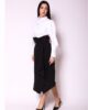Suknja od prugastog štofa, potpuna inovacija u klasičnom izdanju. U modelu je igra asimetrije, kako u kroju, tako i u samim prugama, stvarajući moderan i dinamičan vizuelni efekat. Dubok pojas naglašava struk, dok suptilan, lagan pad materijala dužinom suknje senzualno formira nežne talase, dajući modelu ženstvenu eleganciju i sofisticiran izgled. Savršena za kombinovanje sa bluzama i sakoima iz AMC kolekcije, za upečatljiv, luksuzan outfit.