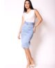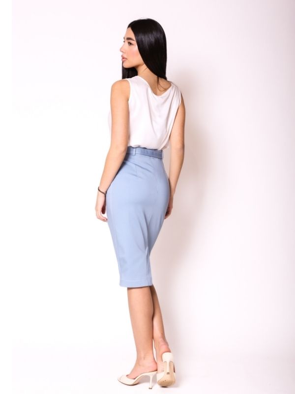 Suknja dužine do kolena donosi skladan spoj elegancije i funkcionalnosti. Model je dizajniran sa diskretnim bočnim šlicem koji omogućava lakše kretanje i dodaje suptilnu dozu ženstvenosti. Kopča se skrivenim rajsferšlusom na zadnjem delu, čime se zadržava čista i svedena linija kroja. Struk je naglašen kaišem od osnovnog materijala sa elegantnom šnalom, dok šira gajka ukrašena krunicom predstavlja poseban dizajnerski detalj koji modelu daje prepoznatljiv AMC pečat. Zahvaljujući svojoj univerzalnoj formi, suknja se savršeno uklapa sa ostalim artiklima iz nove prolećne kolekcije i idealna je za dnevne, ali i poslovne kombinacije.