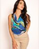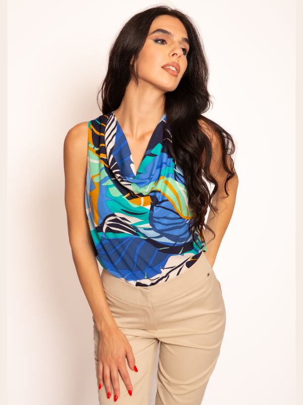 Top se izrađuje u dezenu koji prati celu modernu stilizaciju-zelena sa raskošno narandžastom i azelejom. Pored dezena, ovaj model se radi i u jednobojnim nijansama. Dobro se kombinuje i uz teget i uz crnu, bež, zelenu boju. Bluza/Top je širokih bratela, sa elegantnim padom na prednjici.