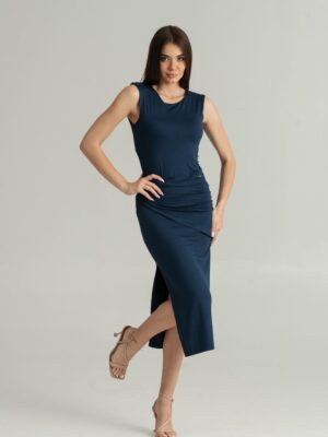 Tunika sa malim detaljem u vidu prstena/šnale u boji ćilibara, koja krasi dekolte ovog modela, čineći ga posebnim. Široke forme, sa šlicevima na prednjici, i zanimljivog polukružnog završetka. Može se nositi sa i bez kaiša, i idealan za veće veličine.